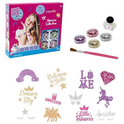 Glitter Tattoo Deluxe set tatuaggi con 4 glitter in polvere, colla, 2 applicatori, 12 stencil da 2 tatuaggi (24 tatuaggi totali)
